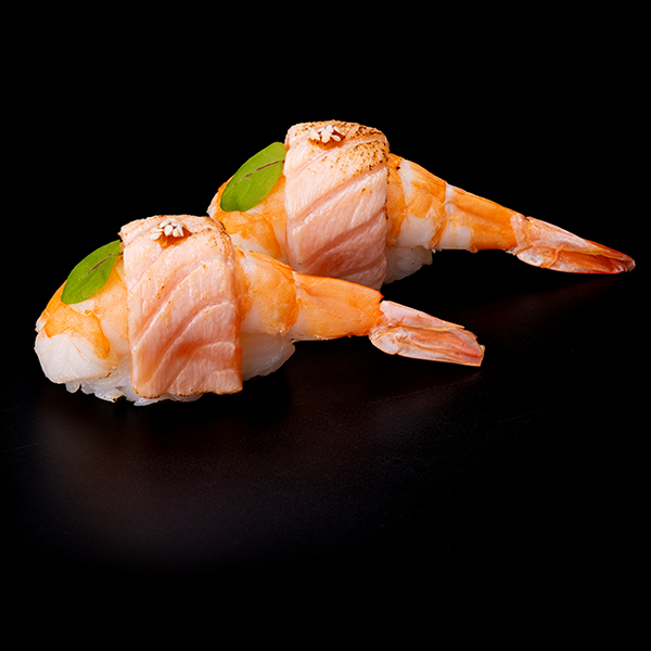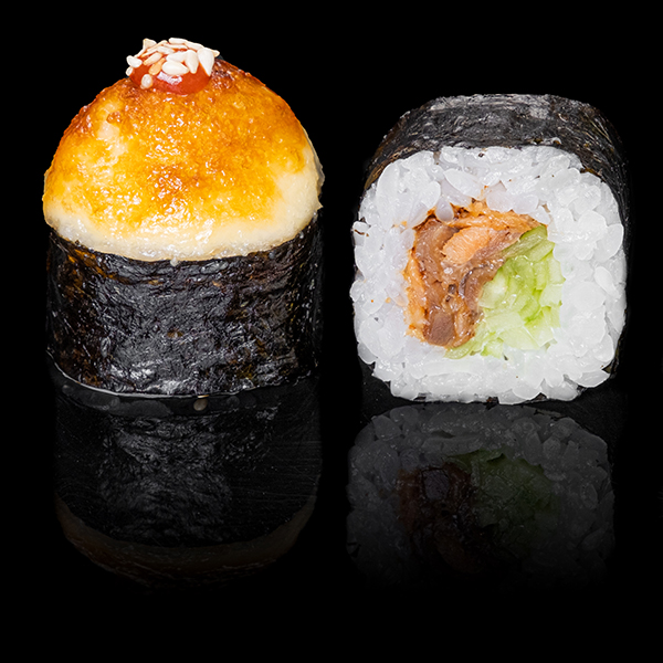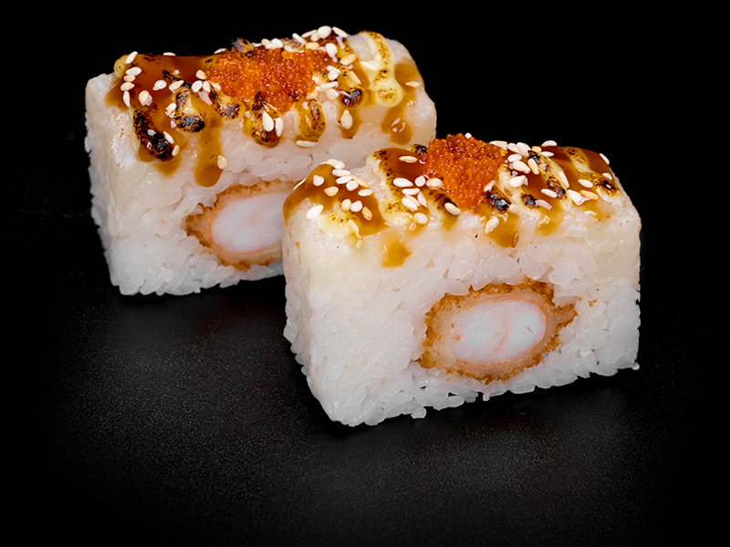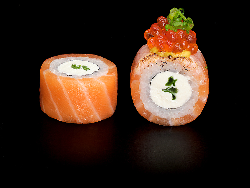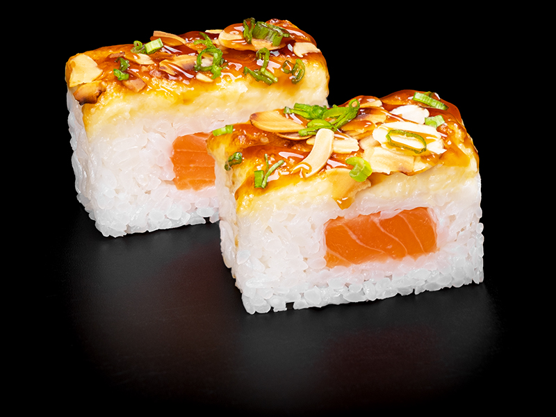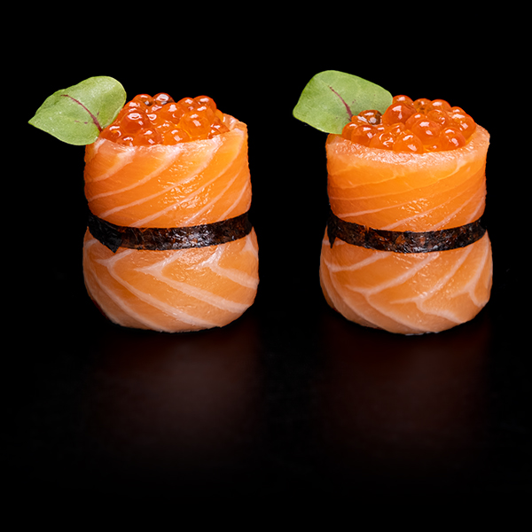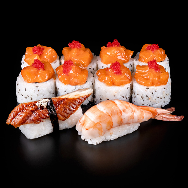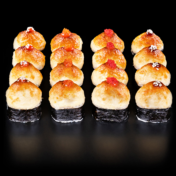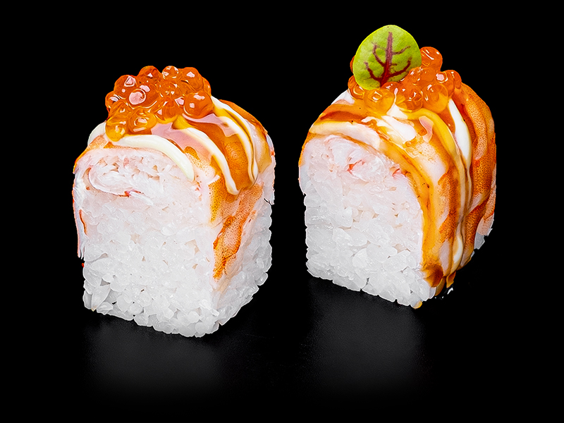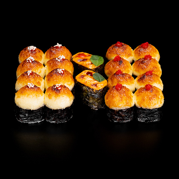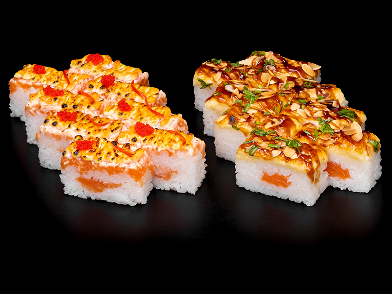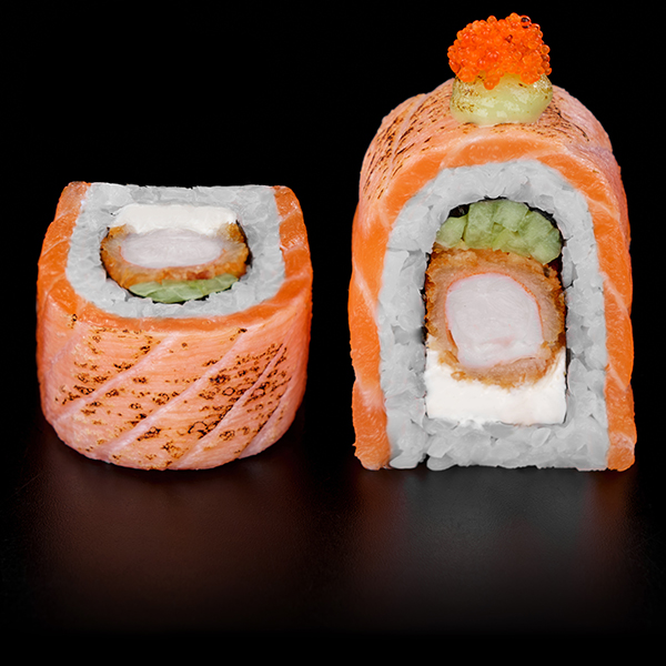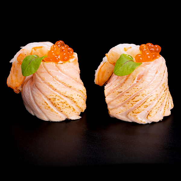 Опалённый фарерский лосось в восхитительном сочетании с тигровой креветкой. Внутри спрятано облако отборного японского риса и фирменный соус Васабико. Венчает это великолепие икра лосося и микрозелень, 5 шт.