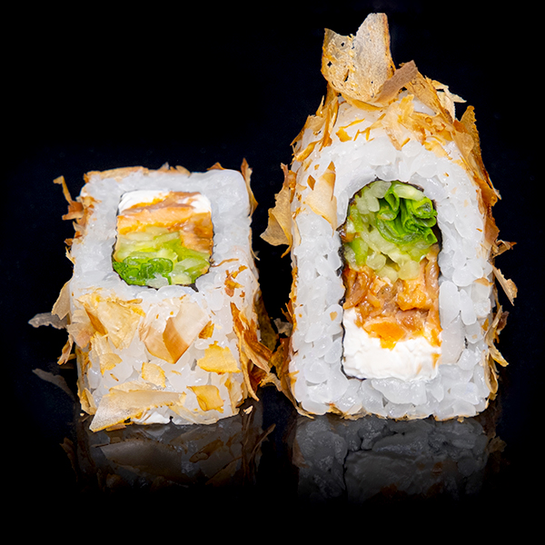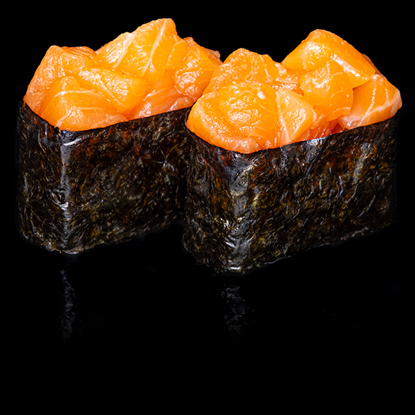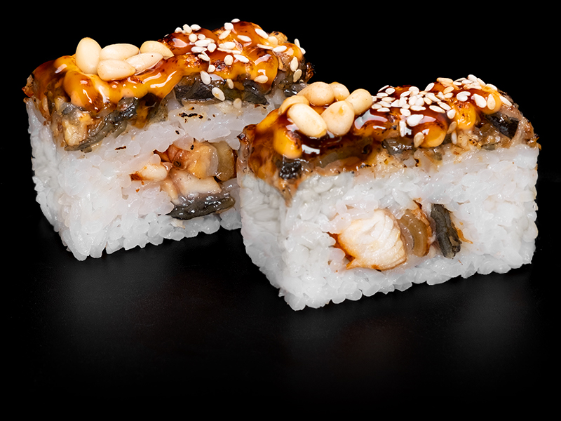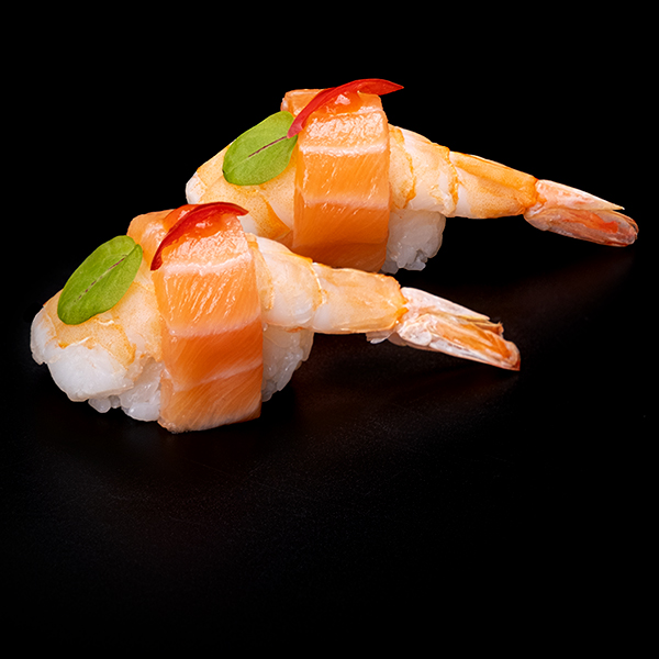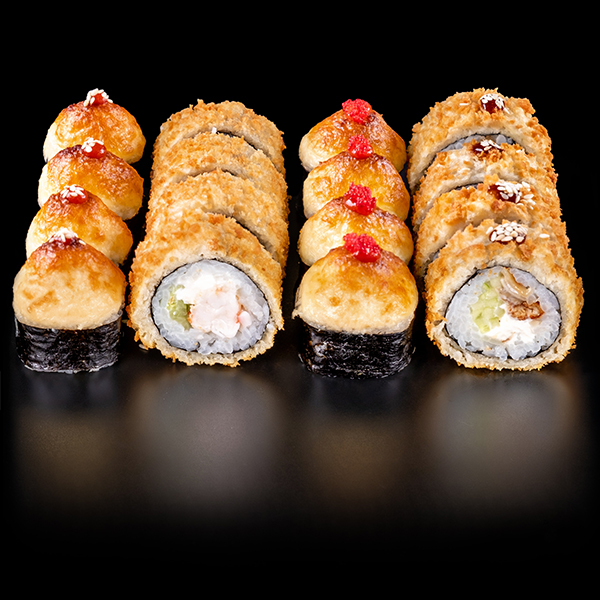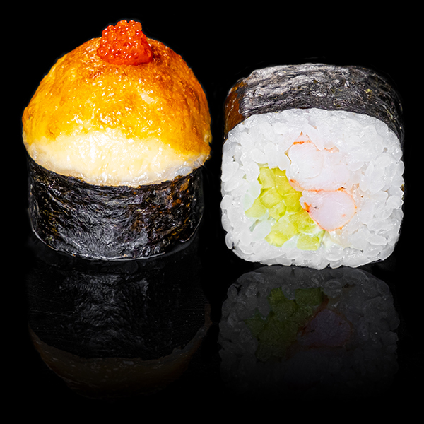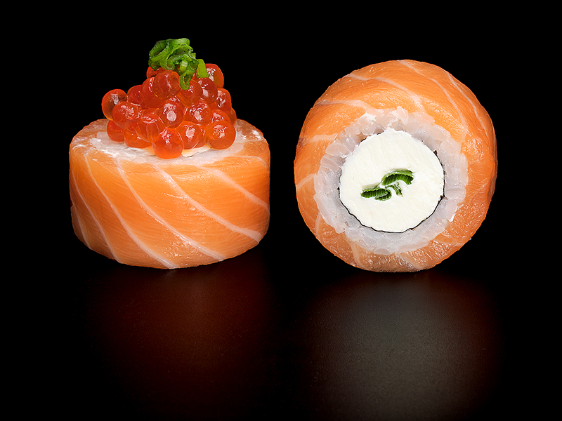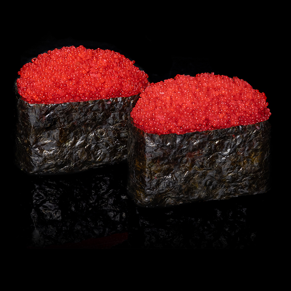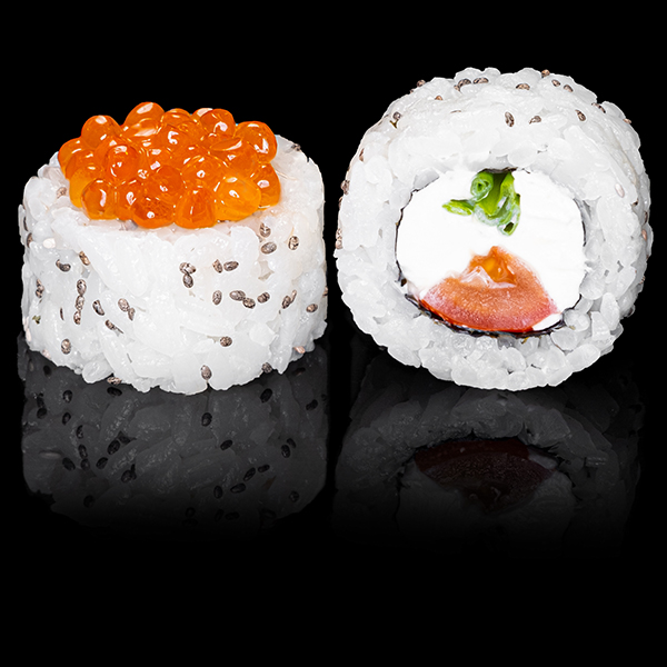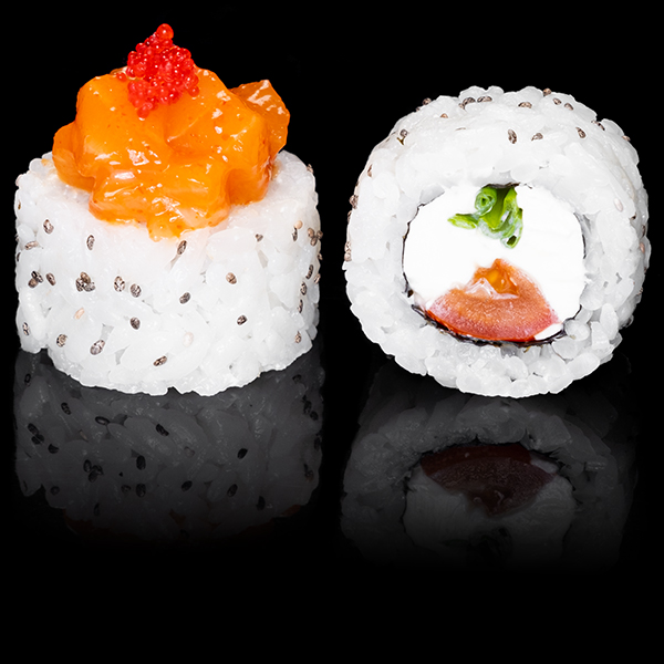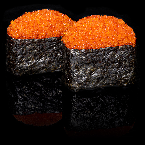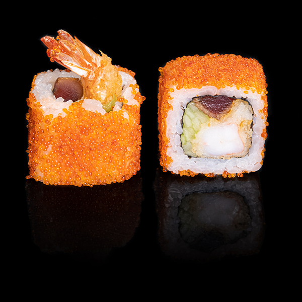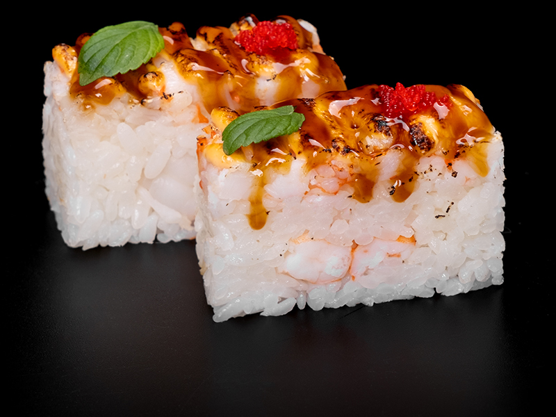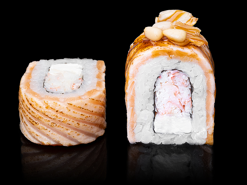 Опалённый фарерский лосось в восхитительном сочетании с тигровой креветкой. Внутри спрятано облако отборного японского риса и фирменный соус Васабико. Венчает это великолепие икра лосося и микрозелень, 5 шт.