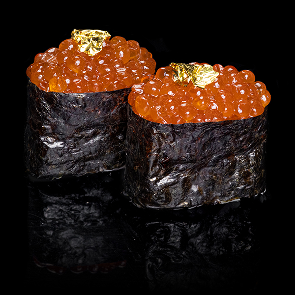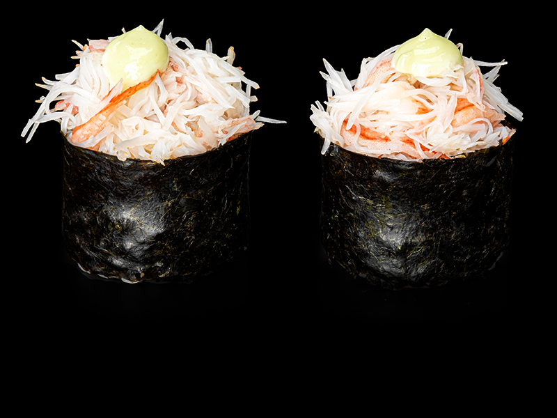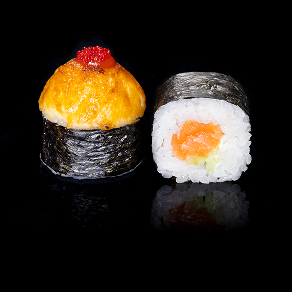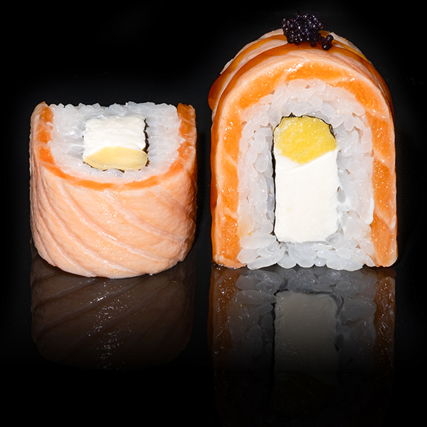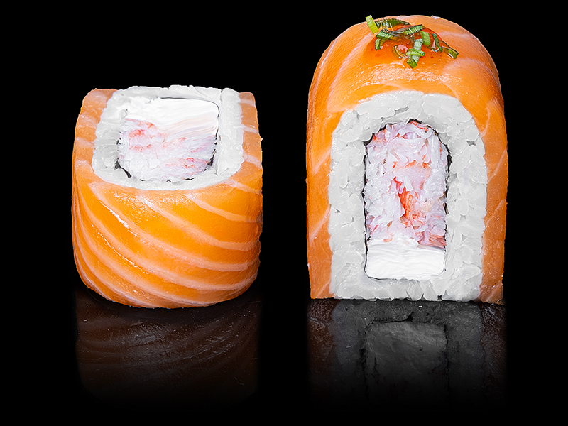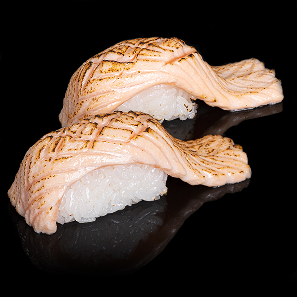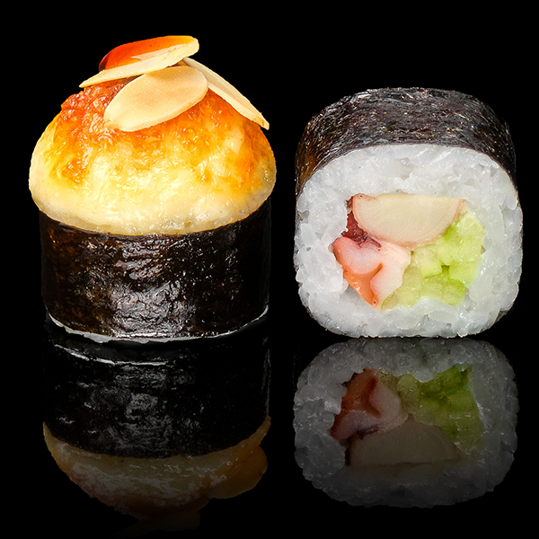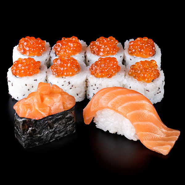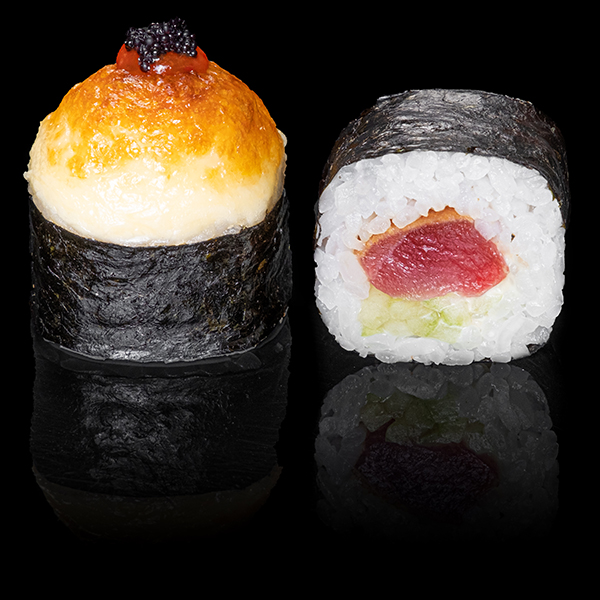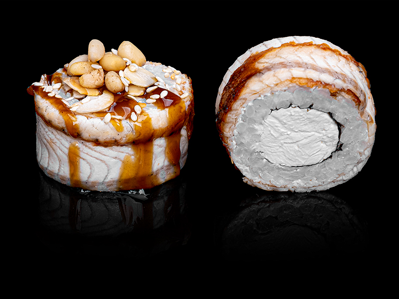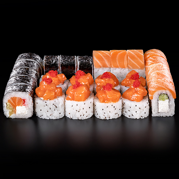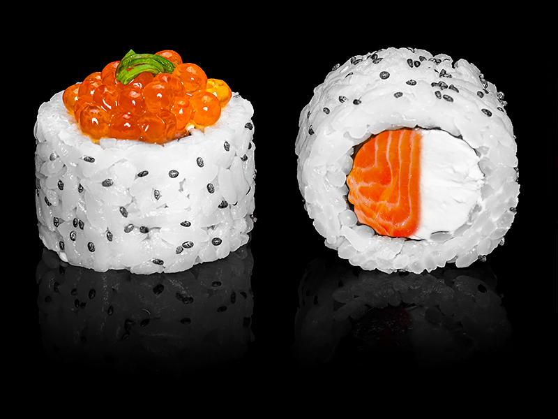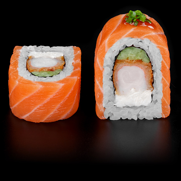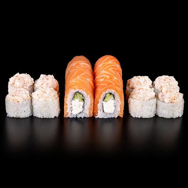 Опалённый фарерский лосось в восхитительном сочетании с тигровой креветкой. Внутри спрятано облако отборного японского риса и фирменный соус Васабико. Венчает это великолепие икра лосося и микрозелень, 5 шт.