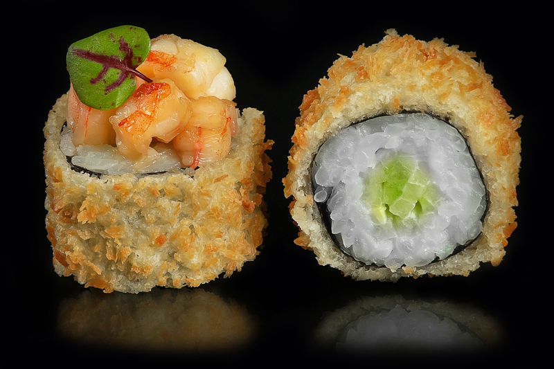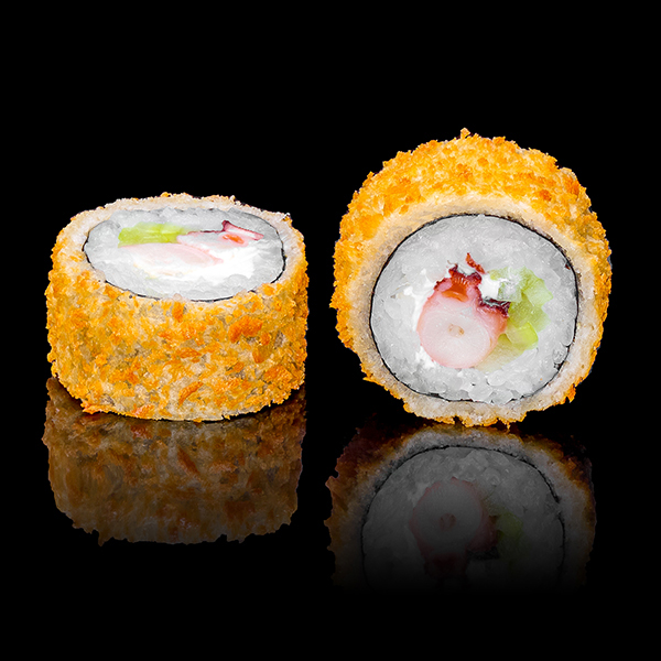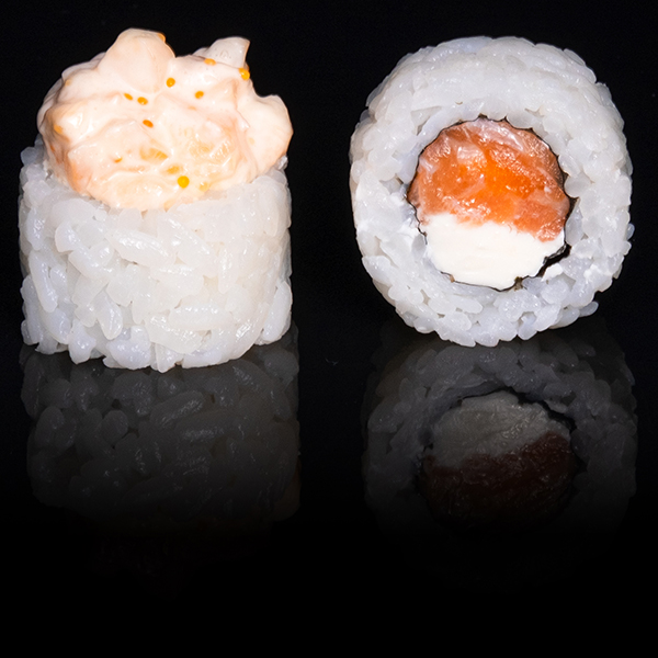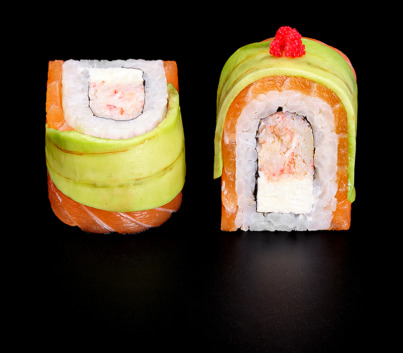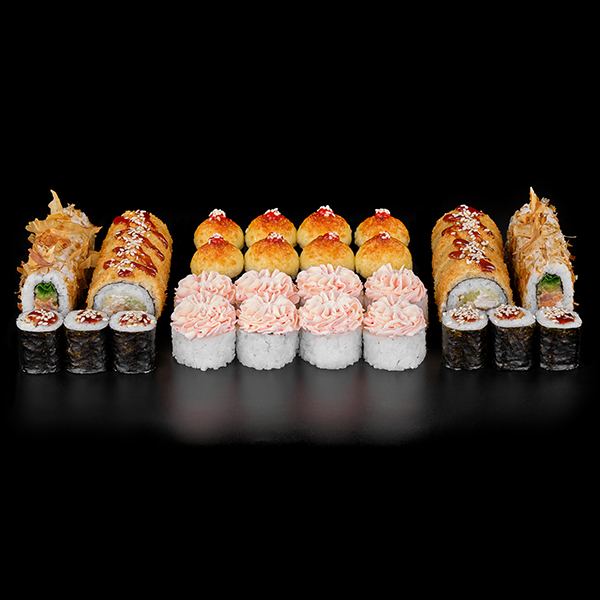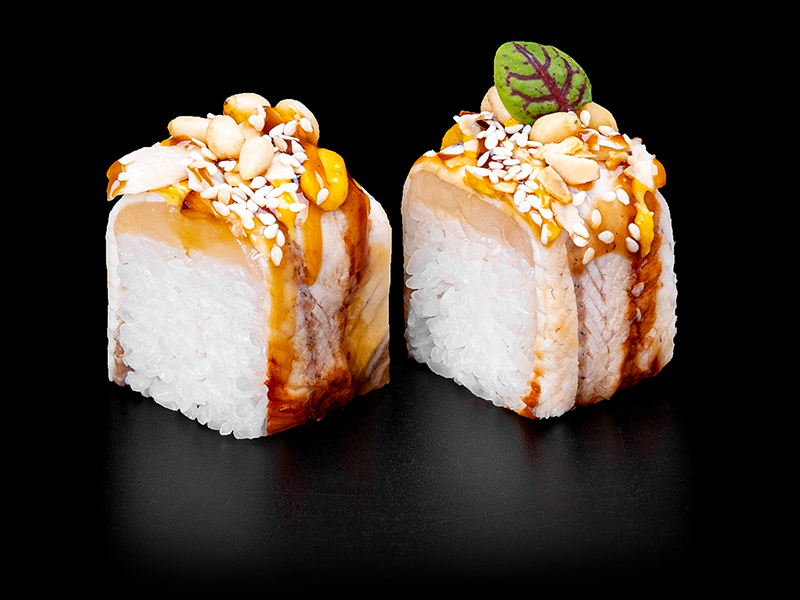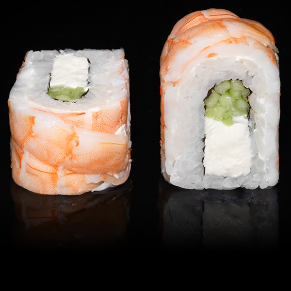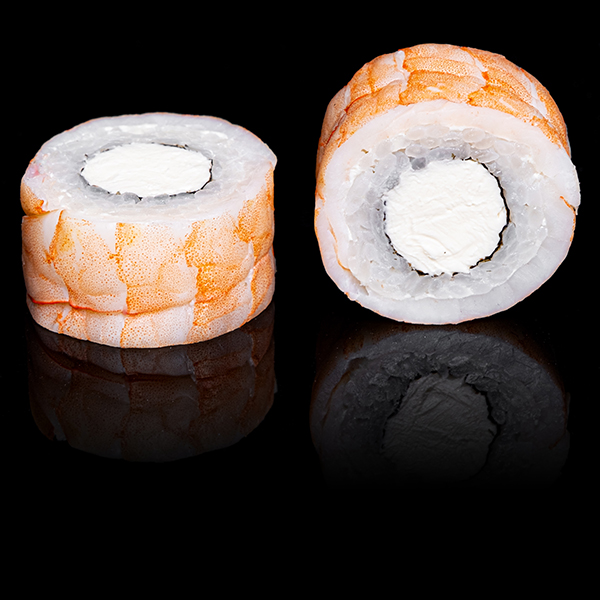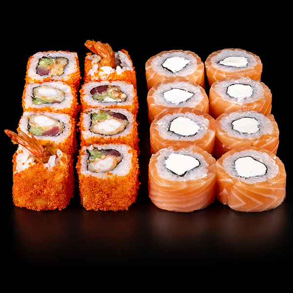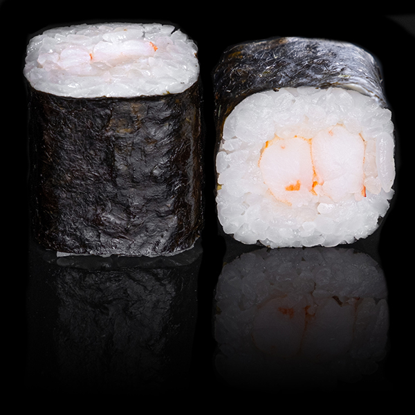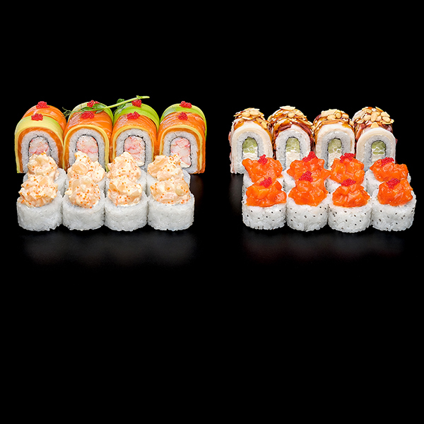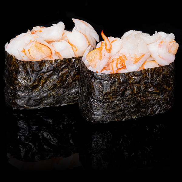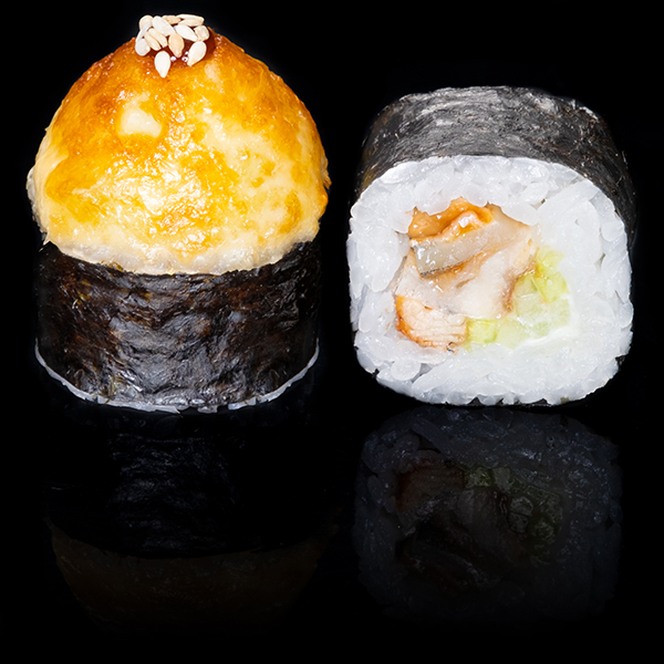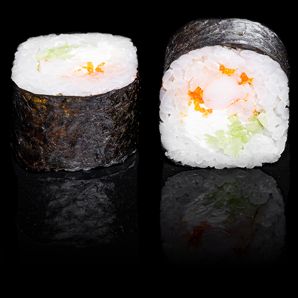 Опалённый фарерский лосось в восхитительном сочетании с тигровой креветкой. Внутри спрятано облако отборного японского риса и фирменный соус Васабико. Венчает это великолепие икра лосося и микрозелень, 5 шт.