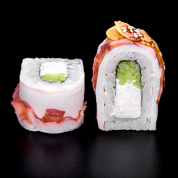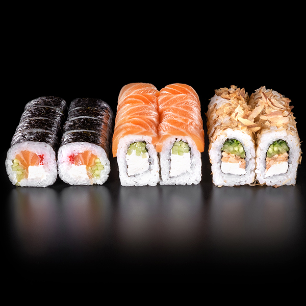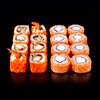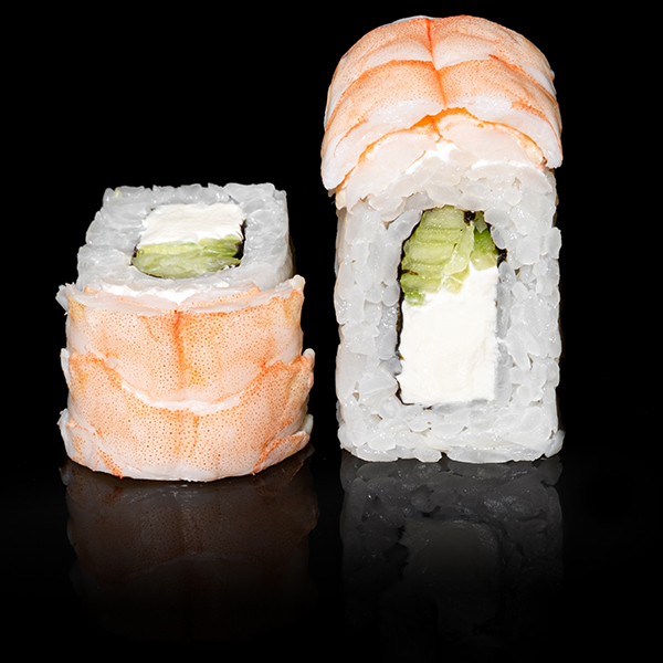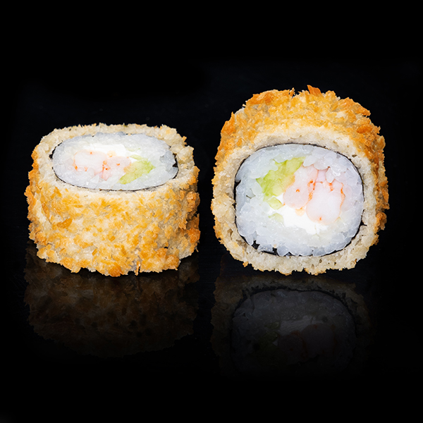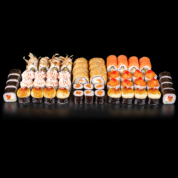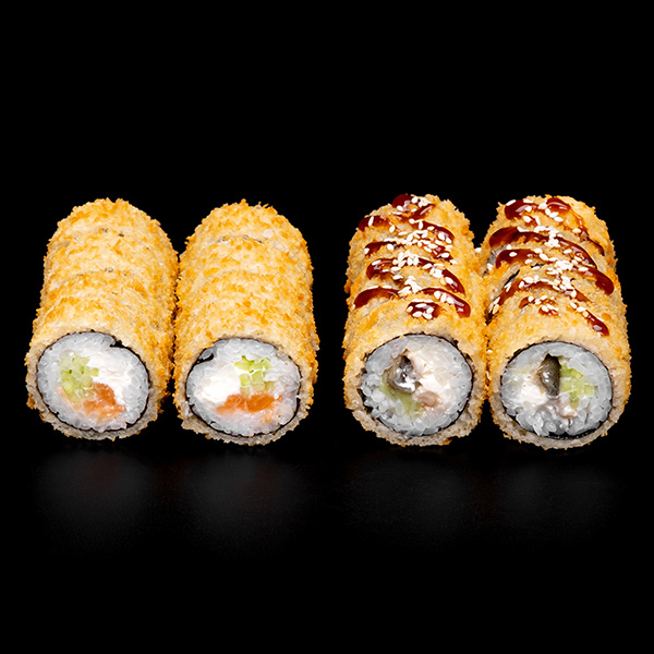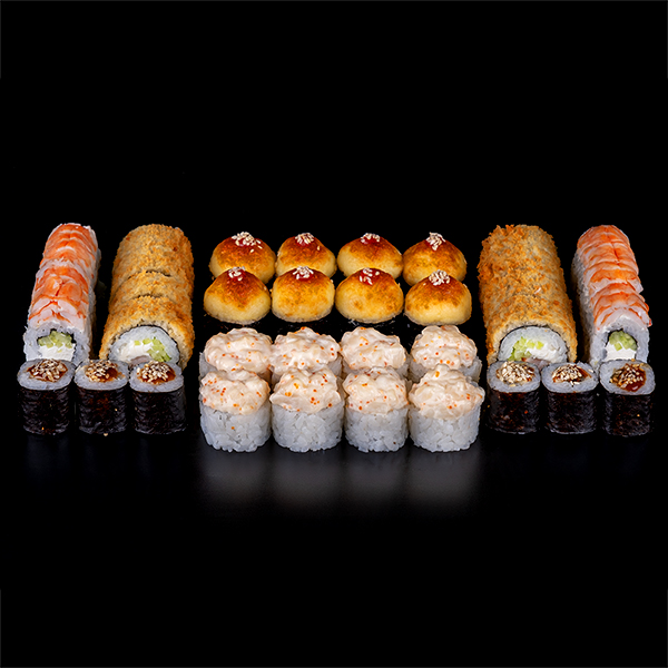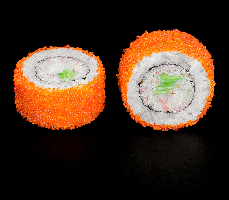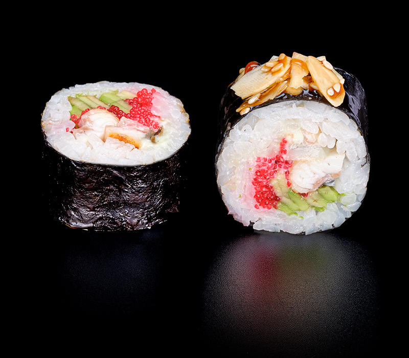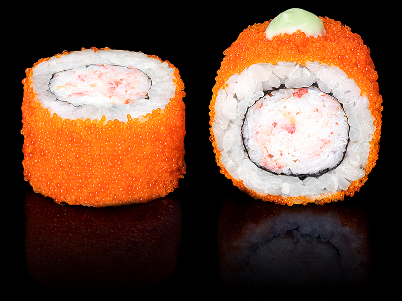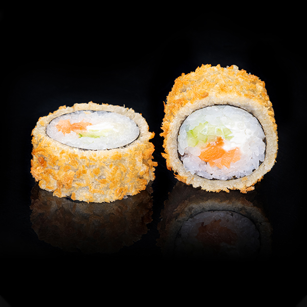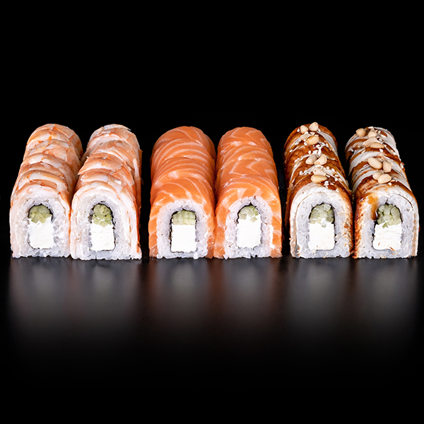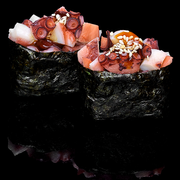 Опалённый фарерский лосось в восхитительном сочетании с тигровой креветкой. Внутри спрятано облако отборного японского риса и фирменный соус Васабико. Венчает это великолепие икра лосося и микрозелень, 5 шт.