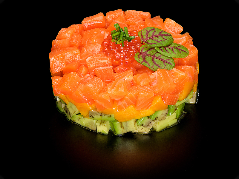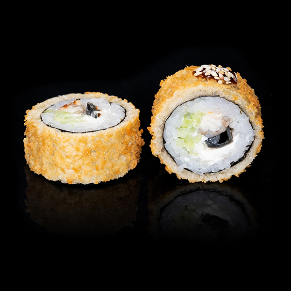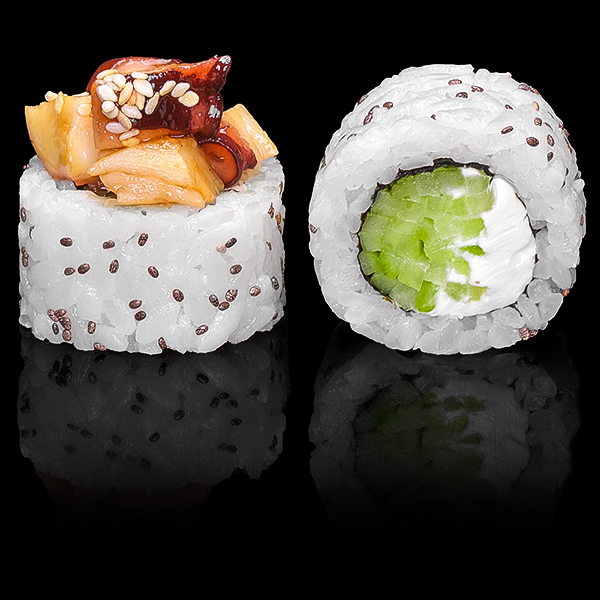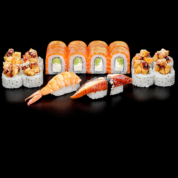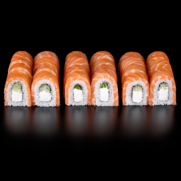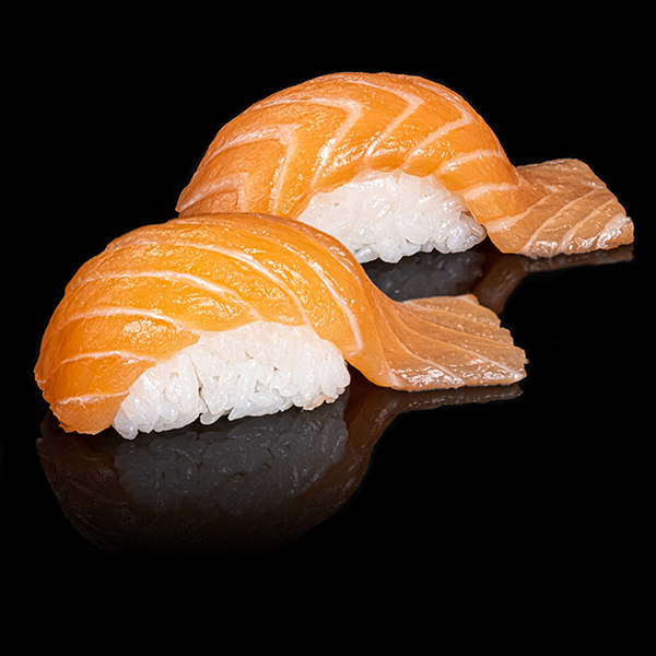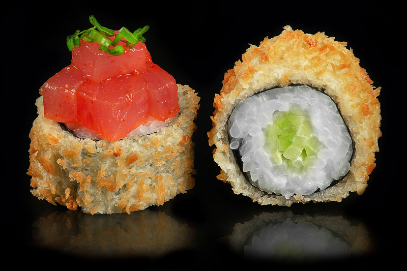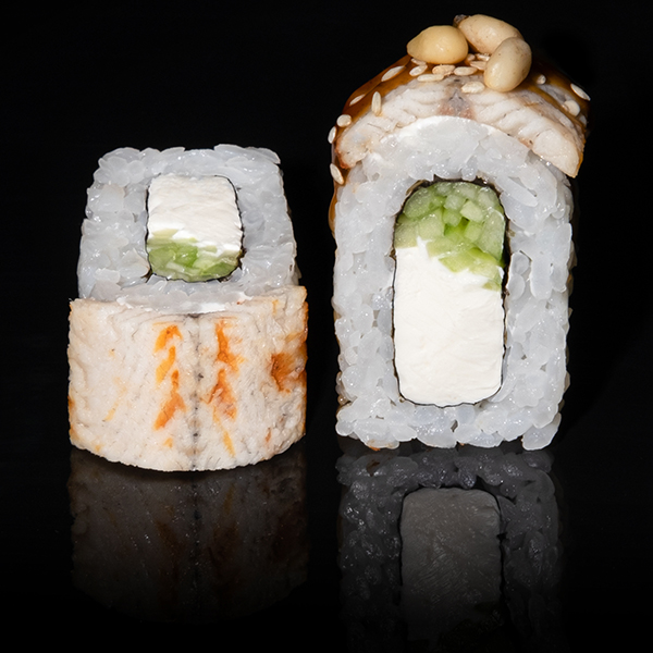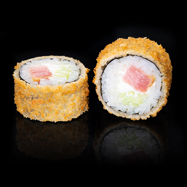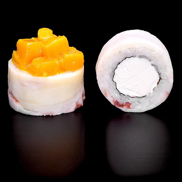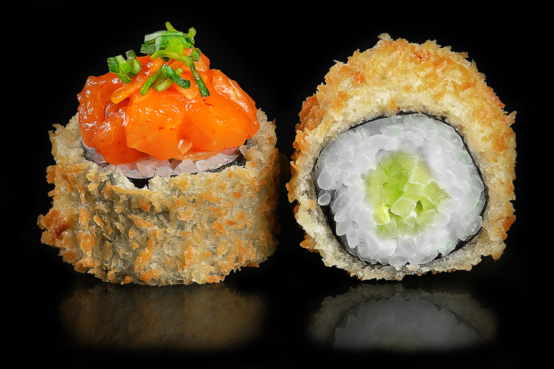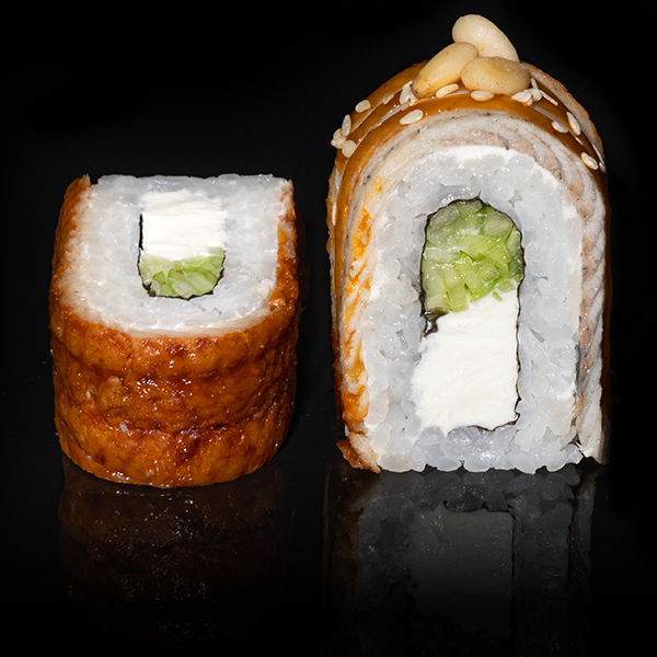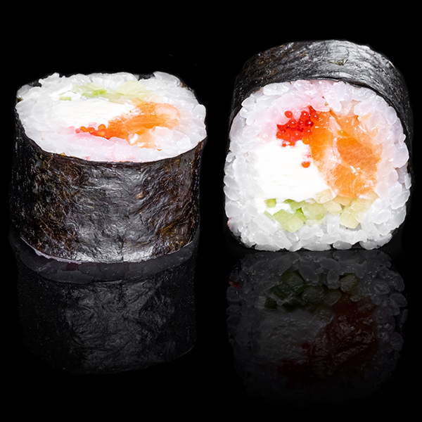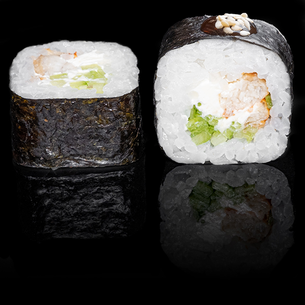 Опалённый фарерский лосось в восхитительном сочетании с тигровой креветкой. Внутри спрятано облако отборного японского риса и фирменный соус Васабико. Венчает это великолепие икра лосося и микрозелень, 5 шт.