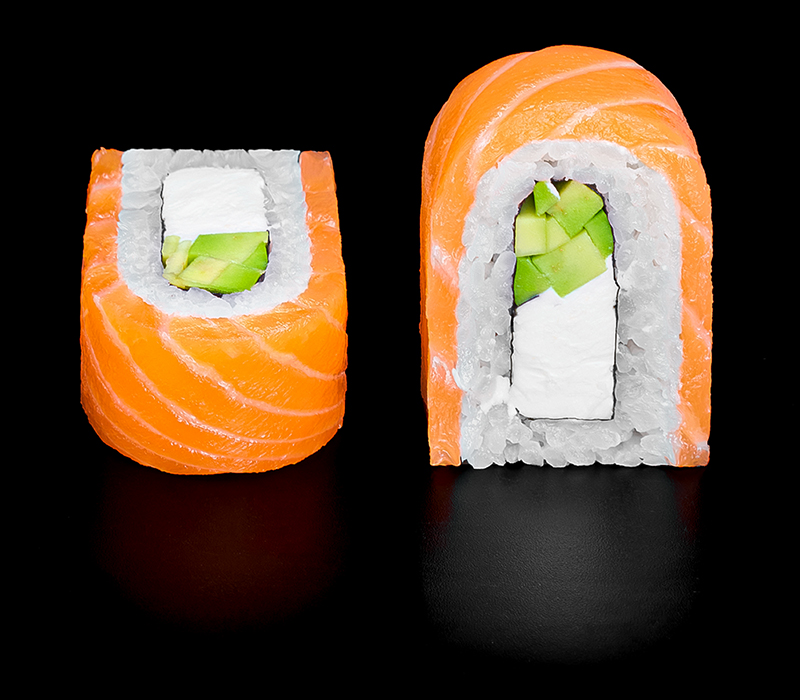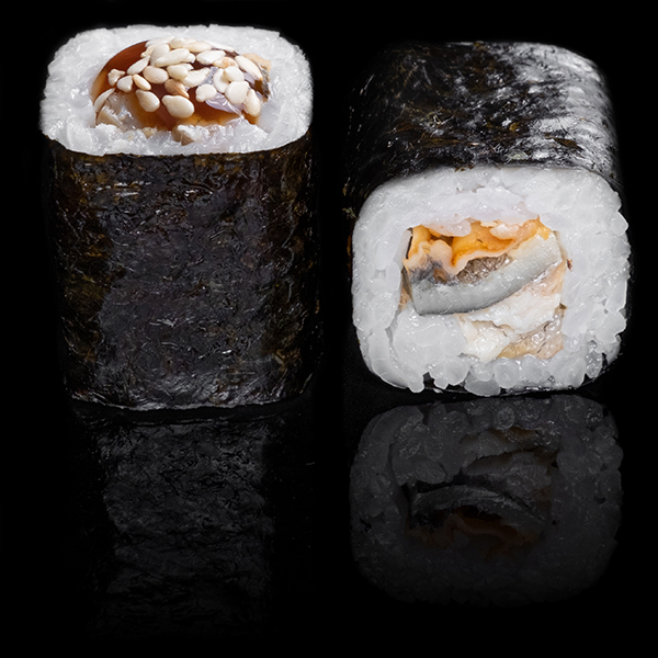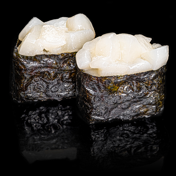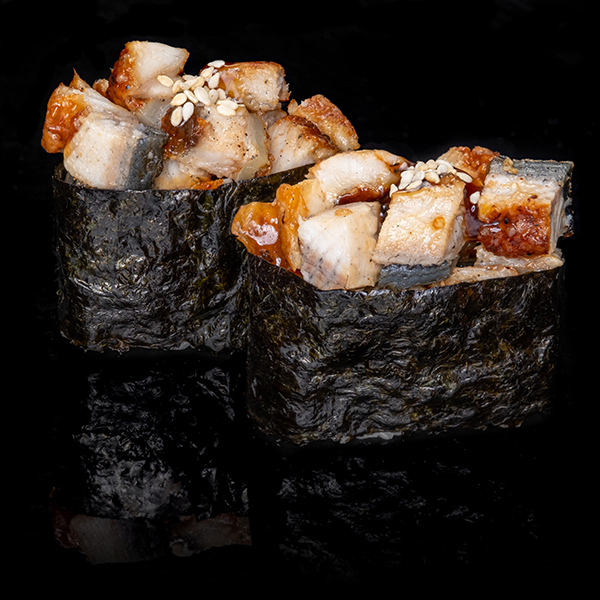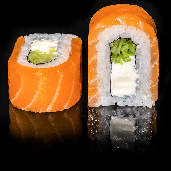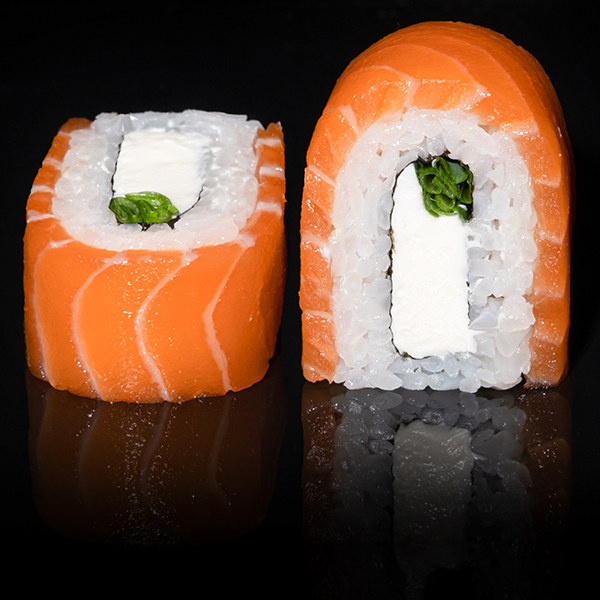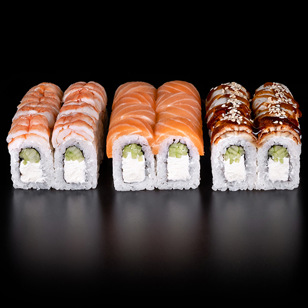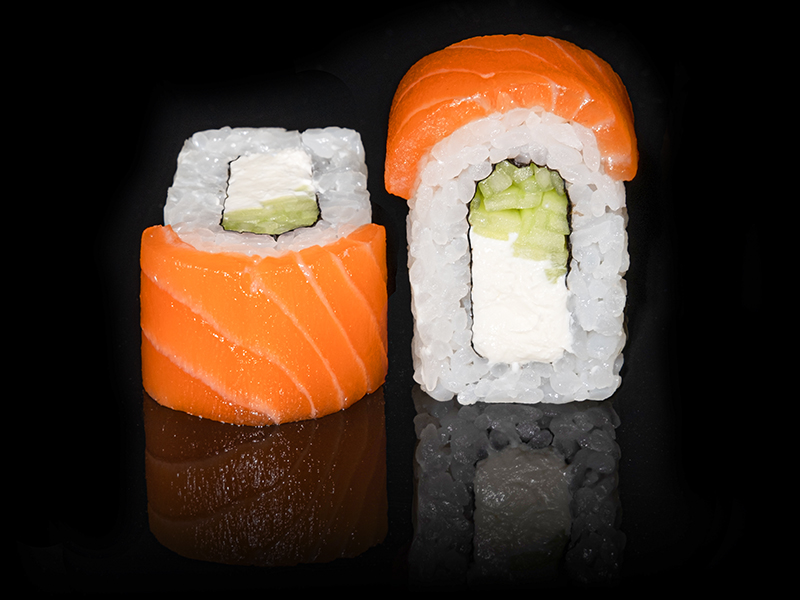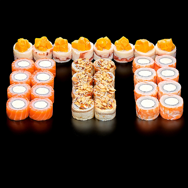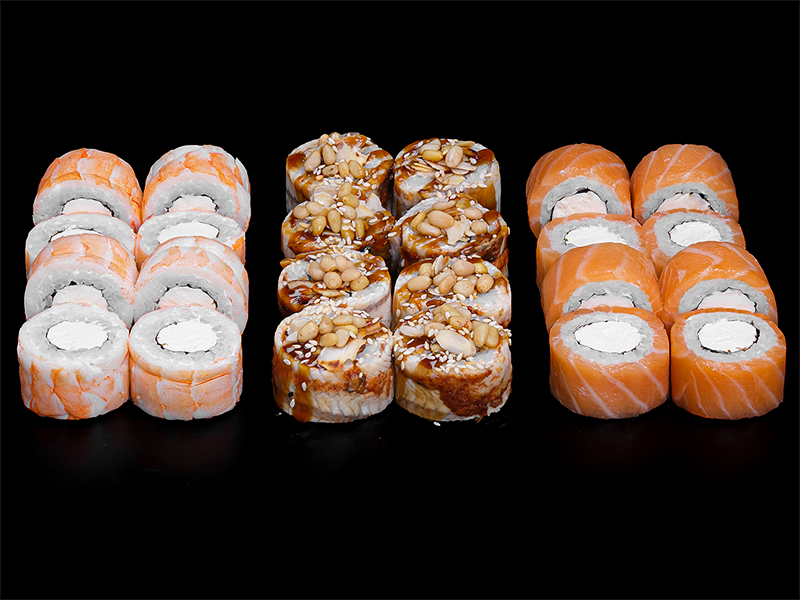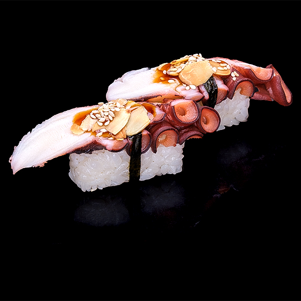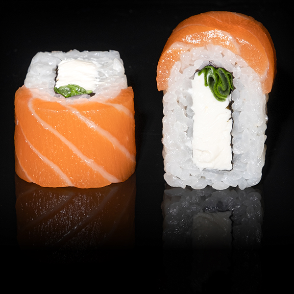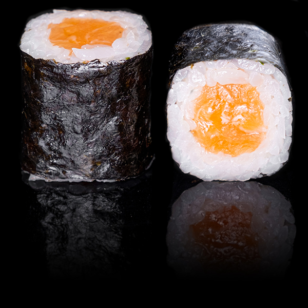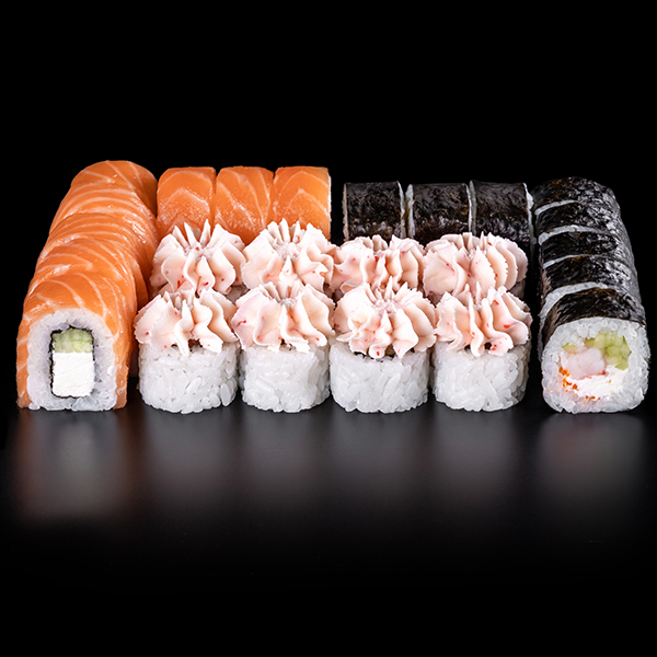 Опалённый фарерский лосось в восхитительном сочетании с тигровой креветкой. Внутри спрятано облако отборного японского риса и фирменный соус Васабико. Венчает это великолепие икра лосося и микрозелень, 5 шт.